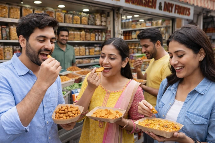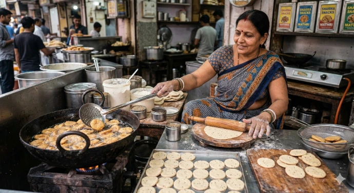 “Yummy Food – Crunchy Mathri, Tasty Chivda, Spicy Masala Kaju and Crispy Namak Para in every bite!”